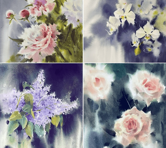 Из абстрактных пятен акварели на листе влажного хлопка мы, как по волшебству, создадим нежность лепестков.