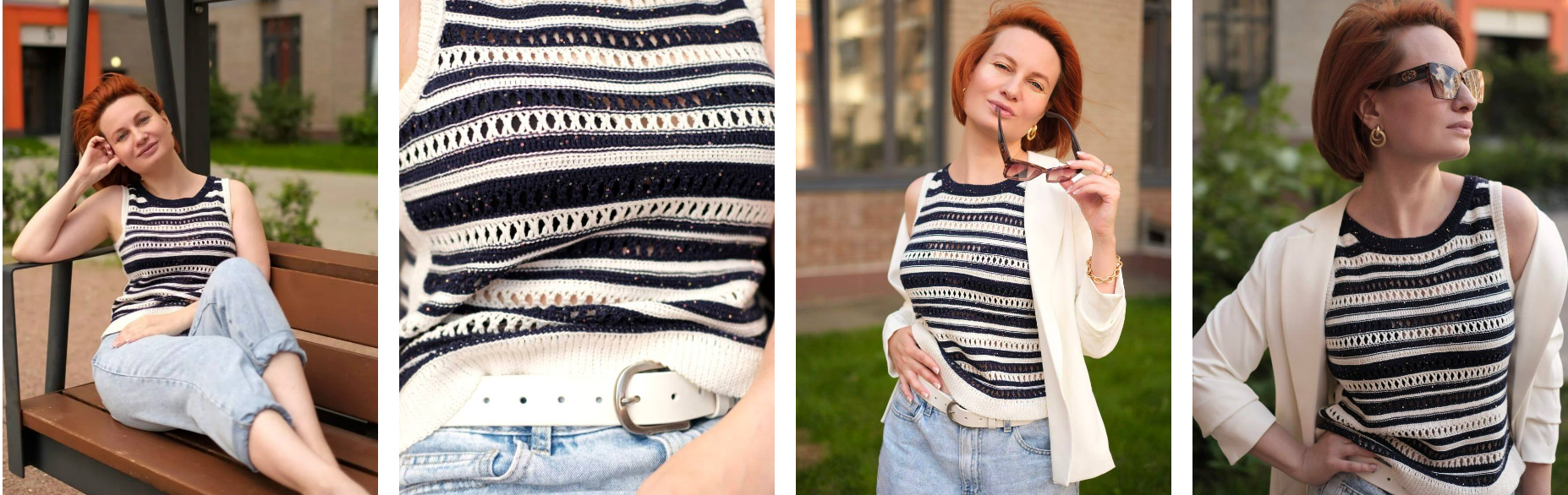 Пряжа должна подходить на крючок от 2.2 (размер Tulip) до 3.0. Она не должна быть сильной мерсеризации, чтобы майка не была жесткой. Лучше всего подойдет пряжа с шелком, тенселем, бамбуком, вискозой или мягкий тонкий хлопок. Толще брать не стоит, будет грубо. Вы можете проконсультироваться по пряже в чате поддержки МК, ссылка на чат - всегда в конце описания.