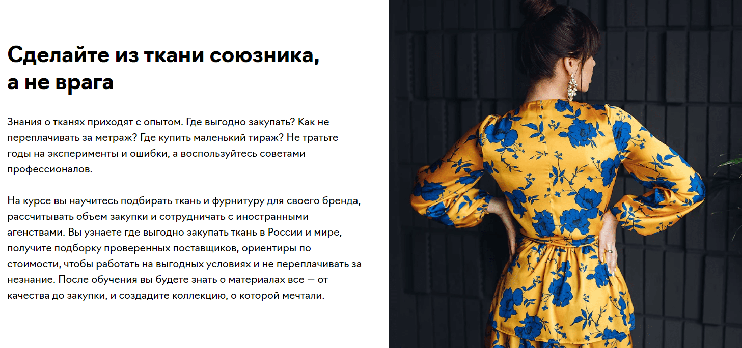 - Вам важно не ошибиться при выборе поставщиков и самих тканей, уметь контролировать качество, знать как можно улучшить условия покупки. И при этом уметь наносить свой принт, чтобы создавать неповторимые коллекции. Курс в этом поможет.