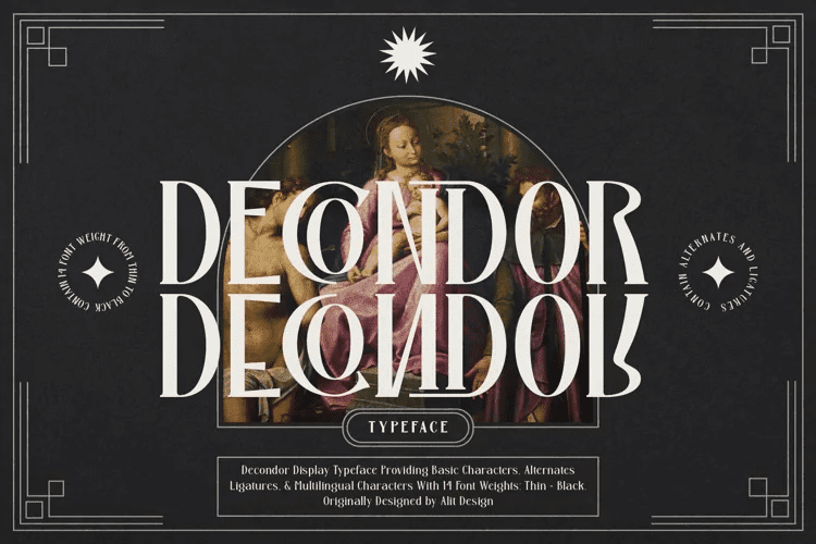 Семейство шрифтов DECONDOR состоит из 14 семейств, от тонких до тяжелых шрифтов. Элегантный современный шрифт создает уникальный дизайн и обязательно привлечет внимание целевой аудитории, занимающейся дизайном. Помимо уникальности, шрифт DECONDOR также обладает роскошным простым характером, что придает дизайну очарование и классическую роскошь.