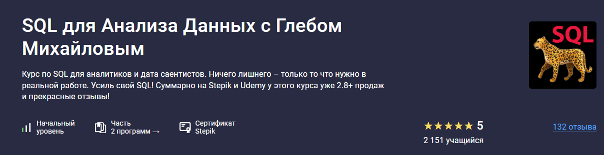 Курс по SQL для аналитиков и дата саентистов. Ничего лишнего – только то что нужно в реальной работе. Усиль свой SQL! Суммарно на Stepik и Udemy у этого курса уже 2.8+ продаж и прекрасные отзывы!stepik.org