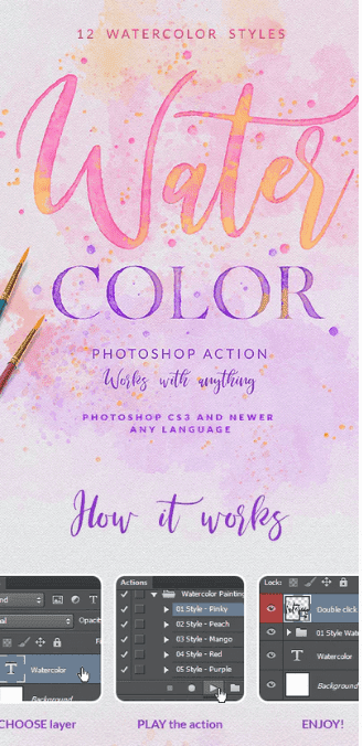 Make your text or logo painted with watercolor The realistic effect of watercolor painting in just a couple of seconds. Nice watercolor colors, 12 different styles, paint drops and splatters. All o...graphicriver.net