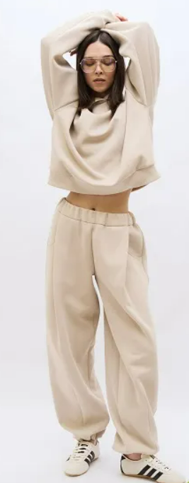 Брюки свободного объёма, полной длины. На передних половинках брюк одна пара односторонних складок, вытачки по линии низа и карманы с фигурной линией входа и отрезной боковой частью. Вытачка располагается по центру и заканчивается ниже линии колена. На задних половинках накладные карманы прямоугольной формы. По низу брюк имеется кулиска, регулирующая объем низа с помощью шнура и фиксаторов. Пояс притачной, прямой, шириной 5,0 см, внутри пояса вставлена эластичная тесьма. Верхний край пояса располагается ниже естественной линии талии на 4,0 см. Шов сиденья спущен на 2,5 см.