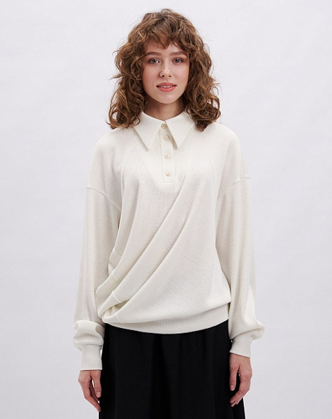 Джемпер свободного объёма, прямого силуэта, длиной до линии бедер. С правой стороны изделия отсутствует боковой шов, смоделирован бочок. Перед с притачными кокетками. Низ изделия обработан притачным поясом. Плечевой шов удлинен. Рукав одношовный, втачной, длиной ниже линии запястья. Низ рукава обработан притачной манжетой. Застежка центральная, не распашная, с притачными планками на 3 обметанные петли и 3 пуговицы. Уровень застежки расположен выше уровня груди. Вырез горловины имеет круглую форму, обработан стояче-отложным воротником с отрезной стойкой, с застежкой на 1 обметанную петлю и 1 пуговицу.
