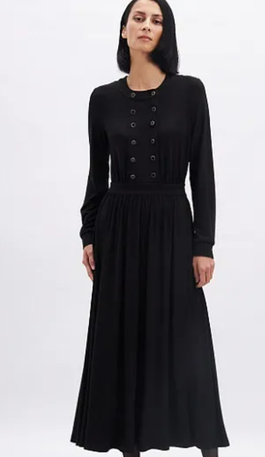 Платье малого объёма, прилегающего силуэта, расширенного к низу, отрезное по линии талии, длиной выше щиколотки, без подкладки. Верхняя часть переда с нагрудной вытачкой из бокового шва, со смещенной бортовой застежкой, на два ряда петель и пуговиц, со сборкой по нижнему срезу Верхняя часть спинки с плечевой вытачкой и со сборкой по нижнему срезу. Верхние срезы нижних частей переда и спинки с интенсивной сборкой. Верхняя и нижняя часть изделия соединены между собой притачным поясом. В левом боковом шве располагается застежка на потайную тесьму «молнию». Рукав втачной, одношовный, длиной ниже уровня запястья. Нижний срез рукава со сборкой, обработан манжетой. Застежка манжеты на 1 обметанную петлю и 1 пуговицу. Горловина изделия круглой формы, обработана притачными обтачками. Застёжка изделия в левом боковом шве изделия на потайную молнию.
