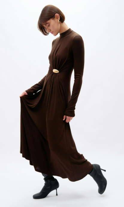 Трикотажное платье малого объёма, полуприлегающего силуэта, расширенного к низу, длиной до щиколотки. Перед с рельефом из проймы, расположенным с левой стороны. Приталивание изделия по переду достигается за счет декоративной застежки на талии, образующей асимметричную драпировку. Спинка со средним швом. Рукав втачной, одношовный, длиной ниже линии запястья. Вырез горловины переда имеет круглую форму, обработан воротником- стойкой. Застежка на потайную тесьму-молнию в среднем шве спинки и в шве воротника-стойки.