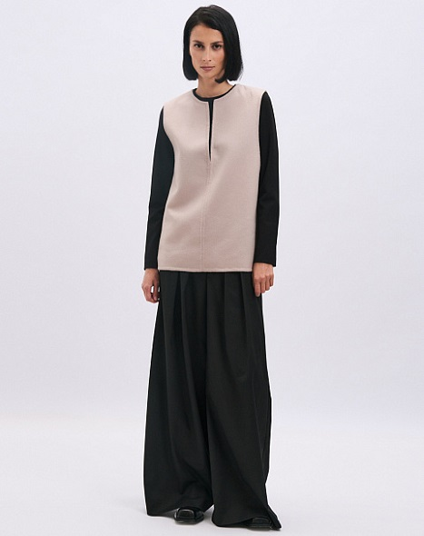 Жилет умеренного объёма, прямого силуэта, длиной ниже линии бедер, без подкладки. Пройма углубленная. Уровень проймы находится выше линии талии на 4,5-3,5 см (в зависимости от размера изделия). Перед со средним швом и разрезом в верхней части. Спинка со средним швом. Вырез горловины круглой формы.