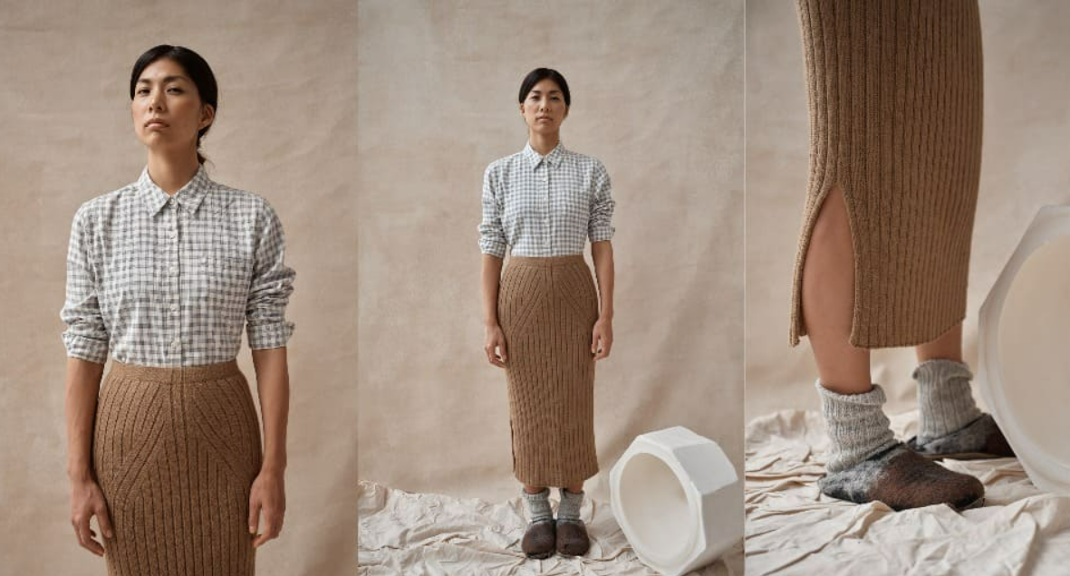 Одежда с деталями смещённой резинкой, казалось, была повсюду, и ей показалось интересным, как можно подчеркнуть фигуру с помощью такой простой техники. Резинка в шахматном порядке напоминают ей о японских садах дзен, таких как знаменитый Реандзи в Киото. Юбка идеально подходит для любого типа фигуры. Сочетайте ее с рубашкой свободного кроя и ботинками для создания непринужденного образа!