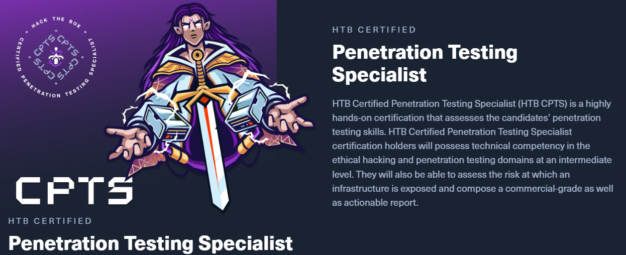 Сертифицированный специалист по тестированию на проникновение Hack The Box (HTB CPTS) - это практическая сертификация, оценивающая навыки кандидатов в области тестирования на проникновение. Обладатели сертификата "Сертифицированный специалист по тестированию на проникновение Hack The Box" будут обладать технической компетентностью в области этичного хакинга и тестирования на проникновение на среднем уровне. Они также смогут оценивать риск, которому подвергается инфраструктура, и составлять отчеты коммерческого уровня, пригодные для практического применения.