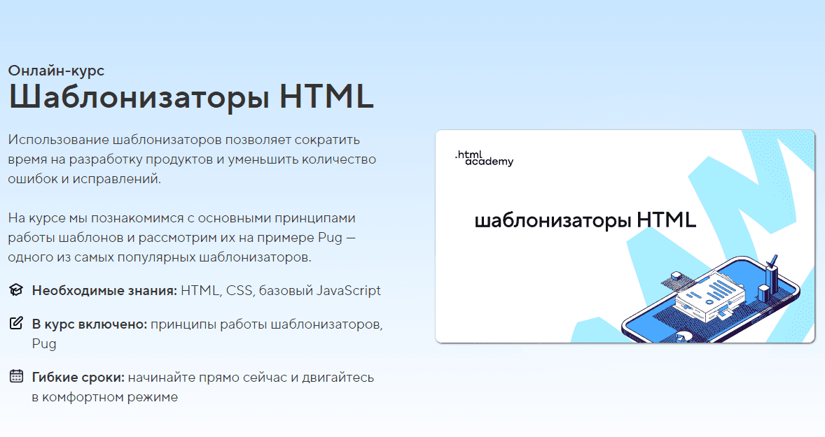 Шаблонизаторы сокращают время на разработку продуктов и уменьшают количество ошибок и исправлений. Начните обучение прямо сейчас и двигайтесь с комфортной скоростью. Курс подходит разработчикам, у которых мало времени и которые хотят повысить свой профессиональный уровень.levelup.htmlacademy.ru