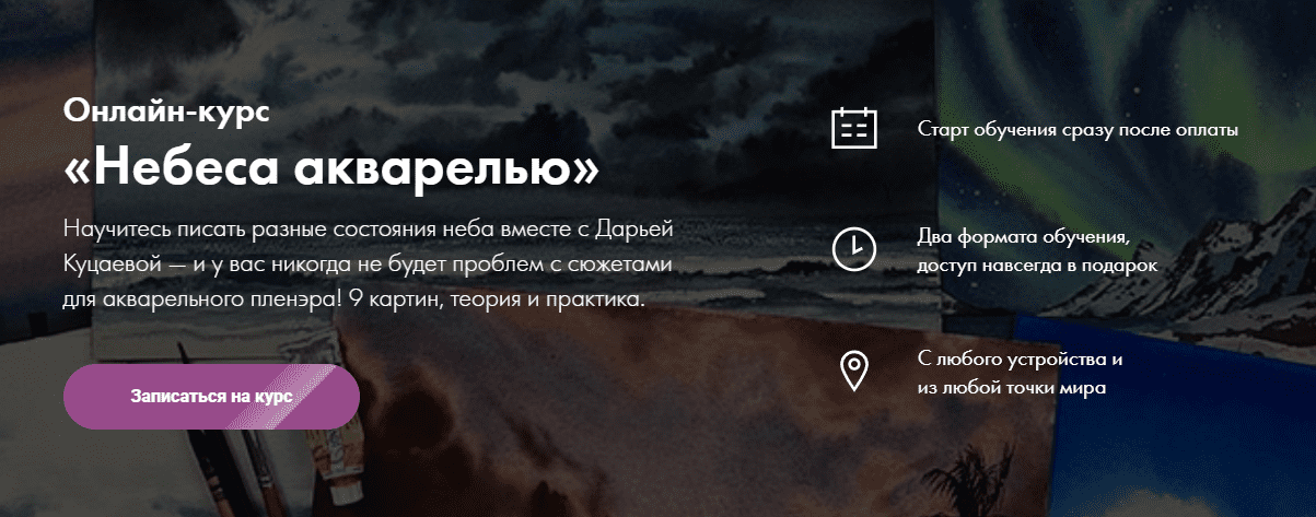Которые хотят стать настоящим профессионалом в живописи по-мокрому. На занятиях вы научитесь делать ровные заливки и плавные градиенты, узнаете, как управлять движением краски, меняя наклон планшета, поработаете разнообразными кистями, будете использовать салфетки и белую темперу. После прохождения курса у вас будет 9 потрясающих этюдов и понимание того, как написать небо в любом состоянии.