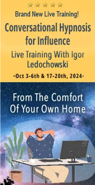 PLEASE NOTE: Aside from the Practitioner & Advanced Practitioner of Conversational Hypnosis For Influence DOUBLE Certification Training taking place this year (in 2024) it may not ever be repeated again. And if it ever is it’s likely to be priced significantly higher than it is here.