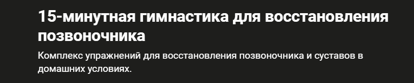 4)Данный курс содержит не только упражнения восстанавливающие гибкость, но и создающие мышечный корсет для позвоночника. Мышечный корсет делает позвоночник более устойчивым к повторным рецидивам и со временем Вы сможете выполнять упражнения комплекса не каждый день, а лишь 1-2 раза в неделю для поддержания формы.