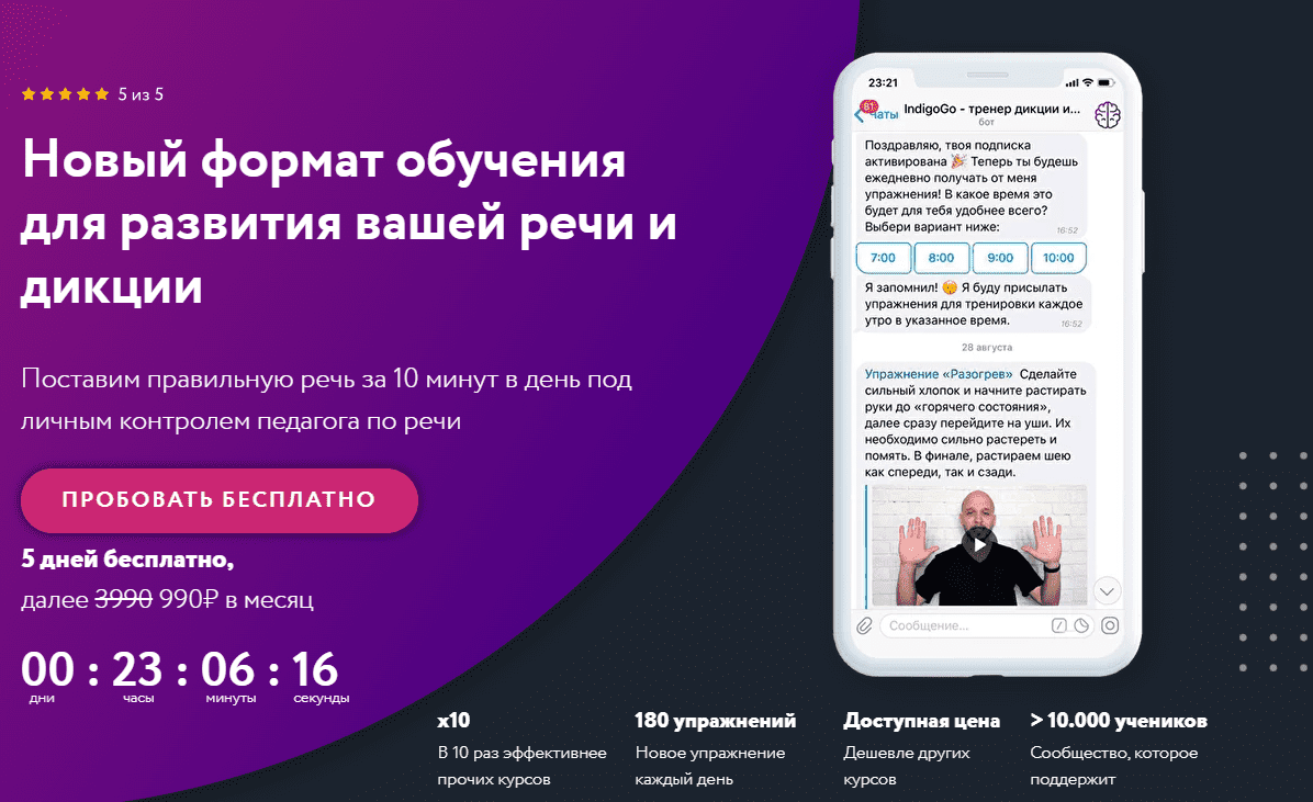 Простой и удобный онлайн-тренер по развитию речи и дикций, включающий в себя 185 ежедневных упражнений и более 25 закрытых онлайн-вебинаров с наставником.