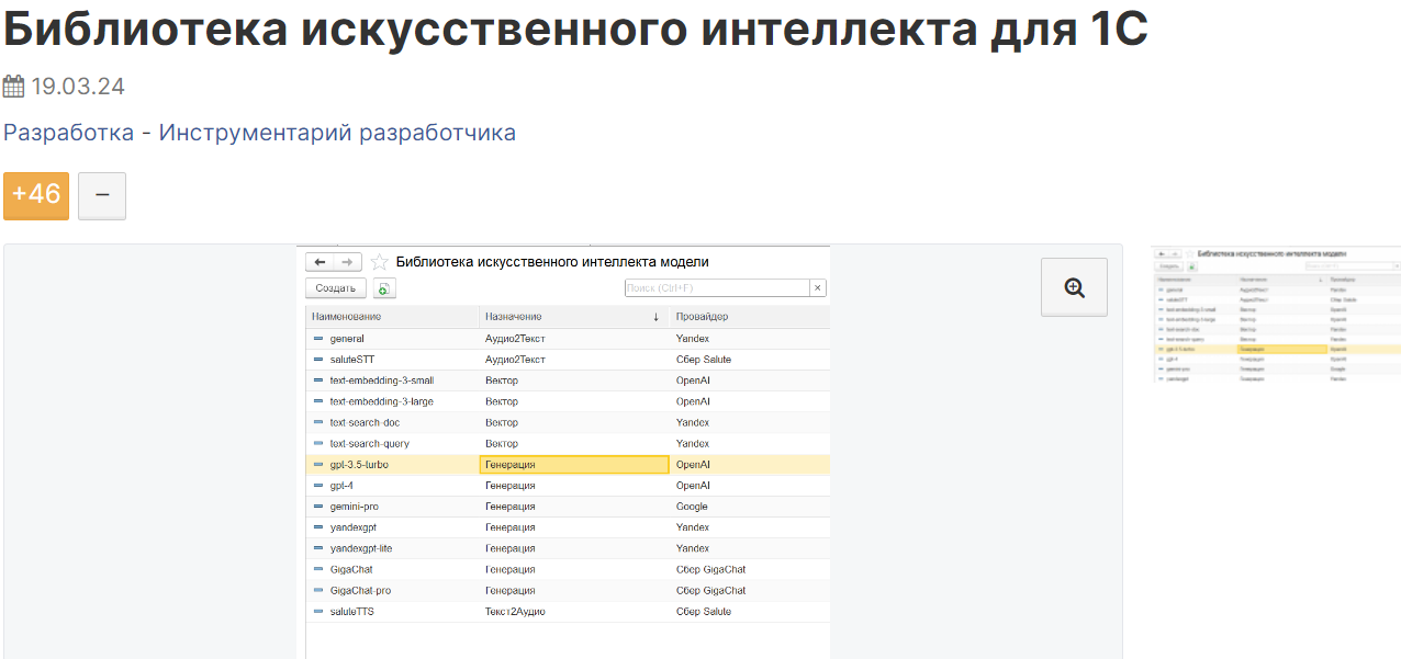 Уже год с лишним, как большие языковые модели (LLM GPT) находятся в центре внимания. За это время появилось понимание, как можно использовать данную технологию в связке с 1С. Кроме того, теперь у нас есть множество провайдеров. Среди них не только зарубежные, но и местные. Данная библиотека обобщает опыт использования искусственного интеллекта в 1С и дает вам возможность создавать собственные решения, не отвлекаясь на второстепенные технические детали.