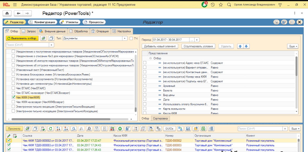 - Отбор данных из объектов, табличных частей и регистров по заданному фильтру.