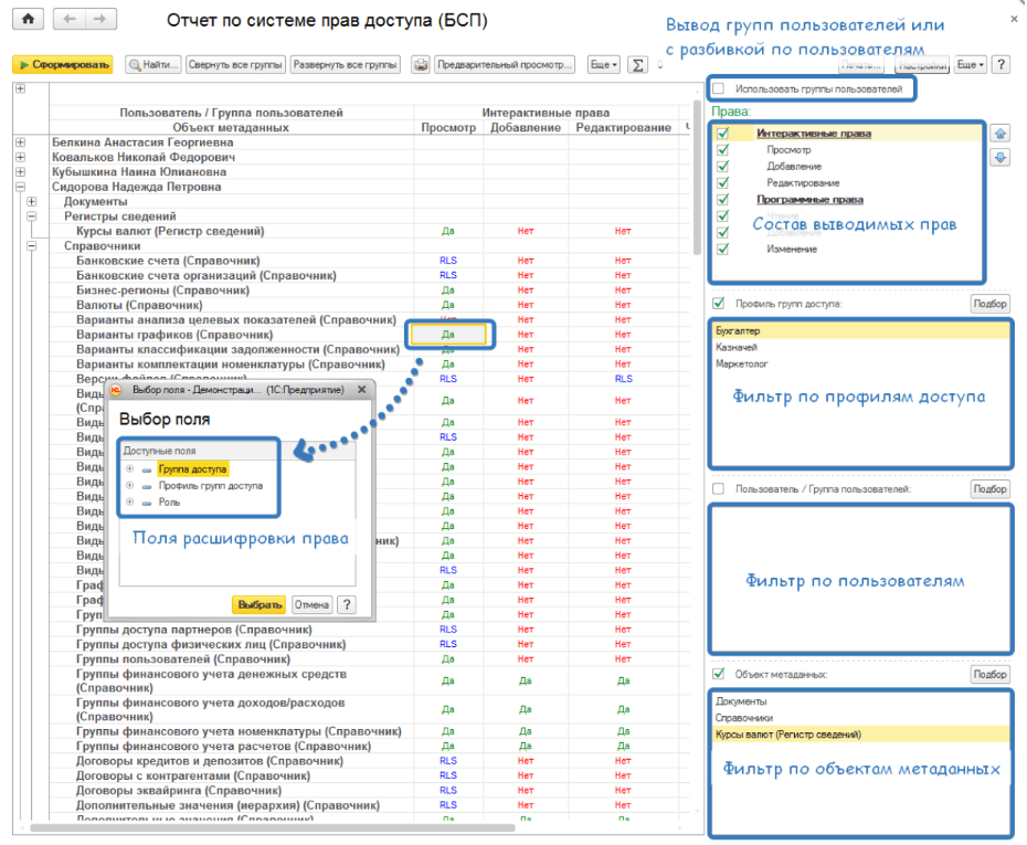 Получение необходимой информации по правам доступа в разрезе групп доступа, профилей групп доступа, пользователей / групп пользователей, объектов конфигурации и ролей. Легко можно настроить состав и порядок вывода информации по правам, настроить необходимые фильтры и получить более детальную расшифровку по группировкам отчета.