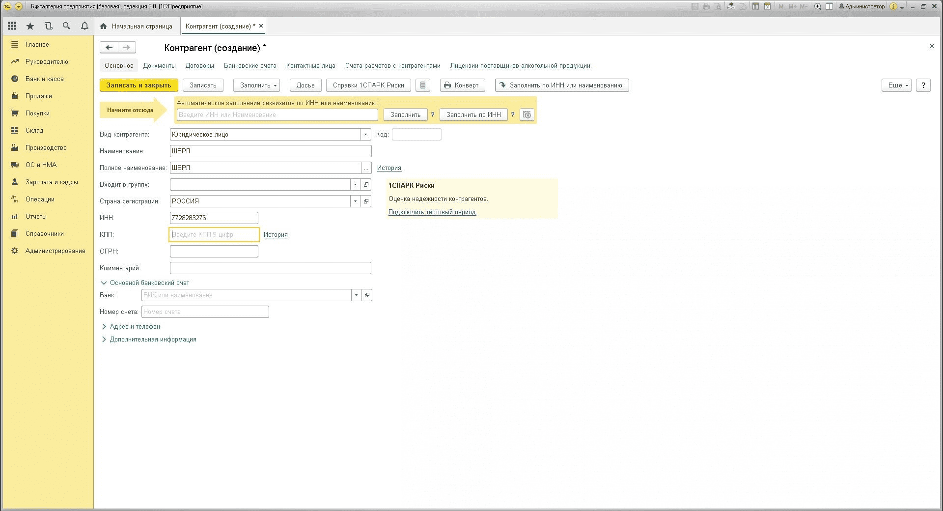 Заполнение контрагента по ИНН или наименованию реквизитов по данным сайта ФНС в 1С: 8.3