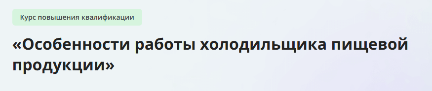 Курс повышения квалификации «Особенности работы холодильщика пищевой продукции» предназначен для специалистов, занимающихся охлаждением и замораживанием пищевых продуктов. В рамках курса слушатели изучают принципы работы холодильного оборудования, методы охлаждения и замораживания разных видов продуктов, а также основы безопасности и экологической безопасности при работе с холодильной техникой. Также курс включает обучение обслуживанию, ремонту и модернизации холодильных установок, планированию работы и контролю за расходом ресурсов.