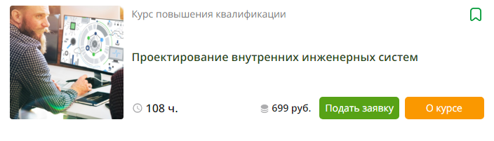 Курс повышения квалификации «Проектирование внутренних инженерных систем» предназначен для специалистов, занимающихся разработкой проектов отопления, тепло-, газо- и водоснабжения, а также водоотведения для зданий и сооружений различного назначения. В рамках курса обучающиеся изучают основные нормативные документы, современные методы и технологии проектирования, принципы работы и характеристики оборудования, методы расчета и выбора оборудования, основы авторского надзора и экологического нормирования. По окончании курса слушателям выдаются удостоверения о повышении квалификации.