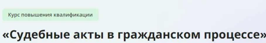 Курс повышения квалификации «Судебные акты в гражданском процессе» направлен на получение знаний, умений и навыков оценивания социальной значимости своей будущей профессии, повышение уровня профессионального самосознания и уважительного отношения к закону, добросовестного исполнения профессиональных обязанностей, квалифицированного применения нормативных правовых актов.
