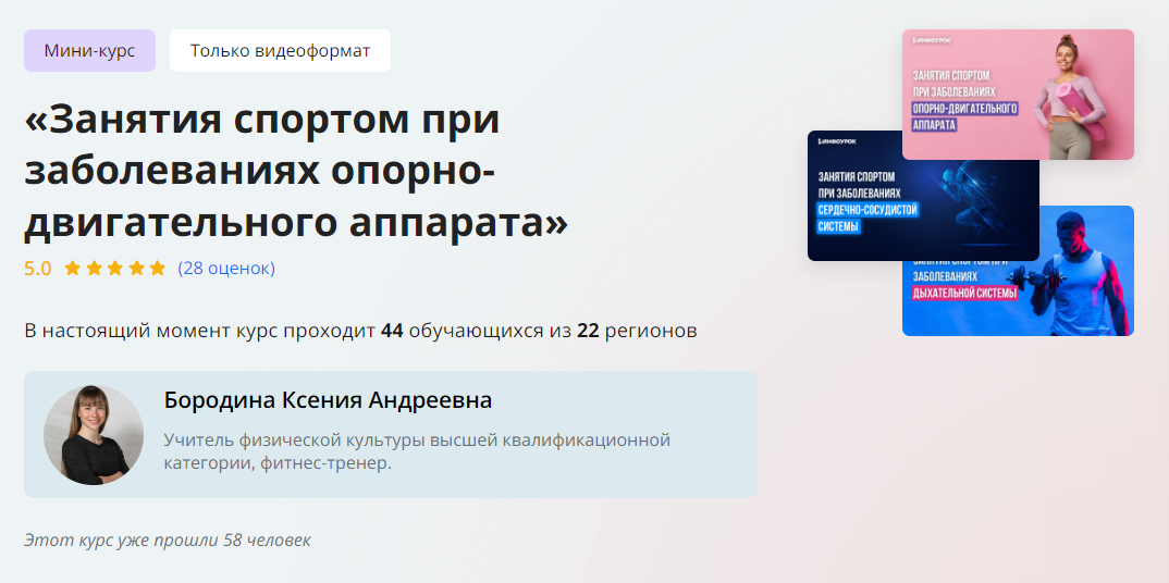 Пройдите обучение на курсе "Занятия спортом при заболеваниях опорно-двигательного аппарата" длительность 3 часа и получите сертификат.infourok.ru