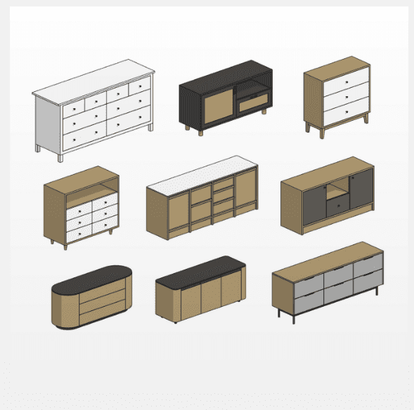 Параметрические семейства тумб и комодов для Revit. Позволяют создавать много разных видов мебели для хранения изменяя различные параметры семейств, такие как: прикроватные тумбочки, тумба с ящиками, тумба под ТВ, комоды различной формы и конфигурации ящиков