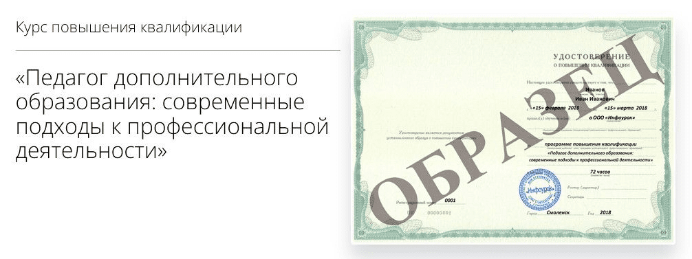 Пройдите обучение на курсе "Педагог дополнительного образования: современные подходы к профессиональной деятельности" длительность 144 часа и получите удостоверение о повышении квалификации или сертификат.infourok.ru