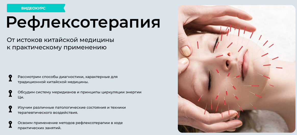 Модуль состоит из 21 урока (средняя продолжительность одного урока — 60 минут) и помогает приобрести структурированную теоретическую базу в области рефлексотерапии.