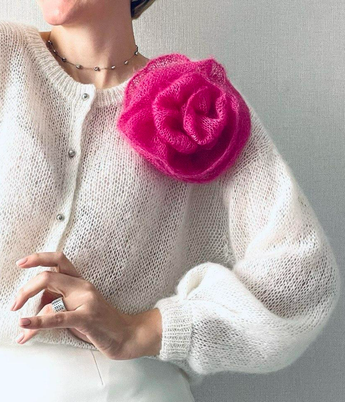 Базовый кардиган с не базовой обработкой горловины. Дополнительным Бонусом добавлен МК на Брошь Розу.