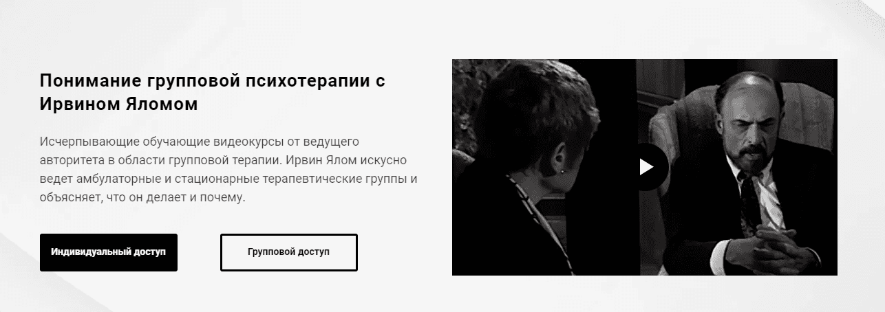 Исчерпывающие обучающие видеокурсы от ведущего авторитета в области групповой терапии. Ирвин Ялом искусно ведет амбулаторные и стационарные терапевтические группы и объясняет, что он делает и почему.newpsy.org