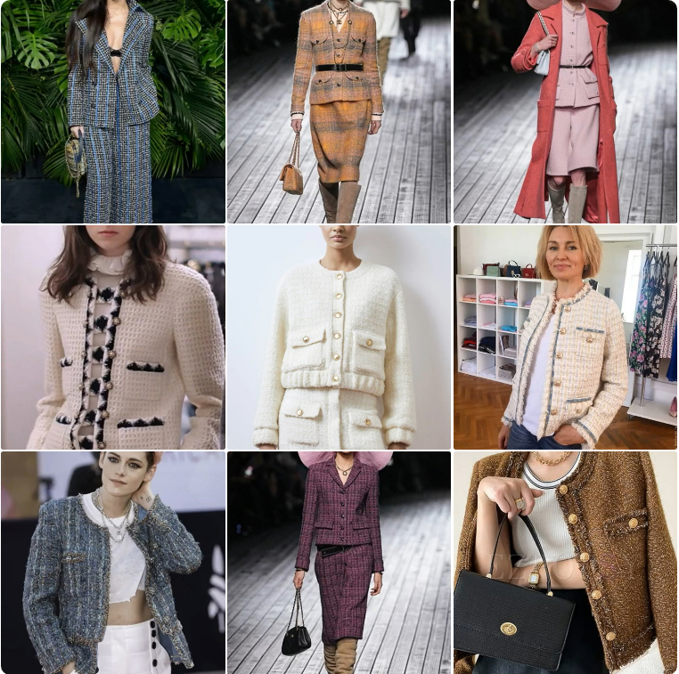 Одним из символов эпохи Шанель и не теряющим своей актуальности, даже наоборот, все больше её набирающим, предметом гардероба является знаменитый жакет из твида с четырьмя накладными карманами без подборта с подкладом, “золотыми” пуговицами и латунной цепочкой для соблюдения баланса изделия
