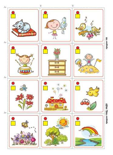 - Карточки с иллюстрациями к каждому предлогу. По 6 карточек на один предлог, суммарно — 120 карточек, 10 страниц формата А4.