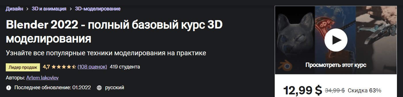 Курс построен для начинающих, описывается каждый инструмент для чего он нужен и как применять. Каждый пример следует применять на практике. На курсе показывается актуальная версия blender 3D. Программа Blender является лидером среди 3д программного обеспечения.