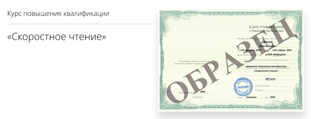 Пройдите обучение на курсе "Скоростное чтение" длительность 180 часов и получите удостоверение о повышении квалификации или сертификат.infourok.ru