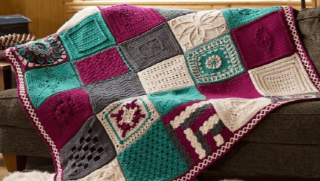 - изучаем технику мозаичного вязания крючком на примере такого пледа, имитирующего пэчворк