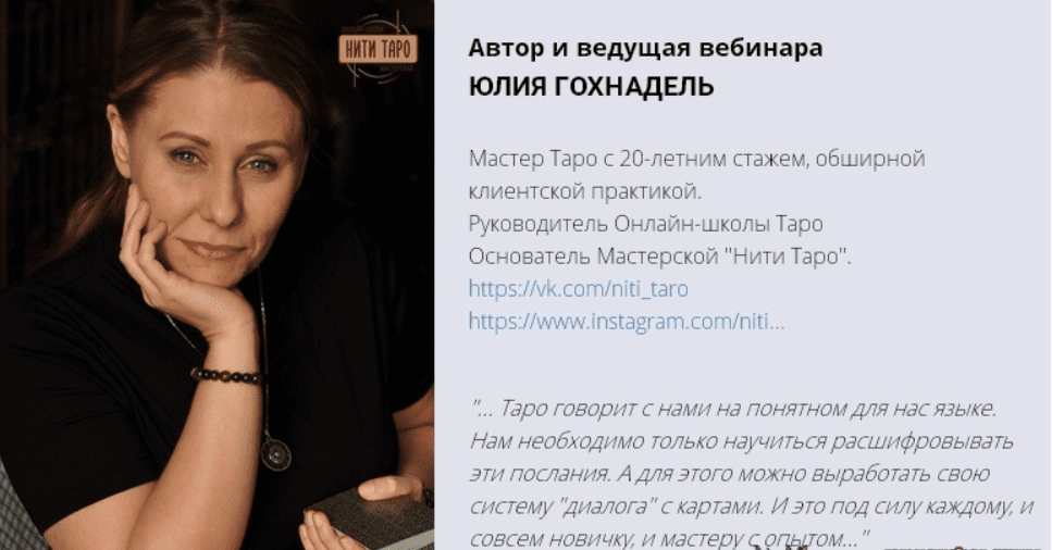 В практической части вебинара мы разберем разные позиции классических раскладов и посмотрим на примере, как меняется толкование Аркана. Также выберем одну из историй участников и разберем её в прямом эфире. Отработать навыки толкования могут все, если вы готовы работать в формате чат-общения.
