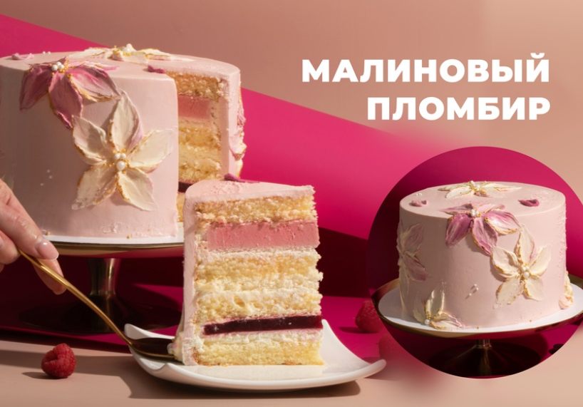 - Торт «Малиновый пломбир». Сливочный ванильный бисквит, сливочная пропитка, малиновое конфи, малиновый мусс и крем «Пломбир». Декор торта - крупные цветы и кремовые мазки
