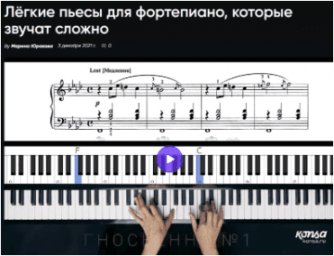Курс будет непосильным для новичка, так как нет объяснений, только камера на руки, ноты и клавиатура, чтобы останавливать на сложных пассажах и уточнить сыгранную ноту.