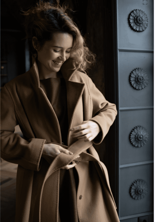 На фото пальто выполнено из мягкой пальтовой ткани, по составу шерсть и кашемир.