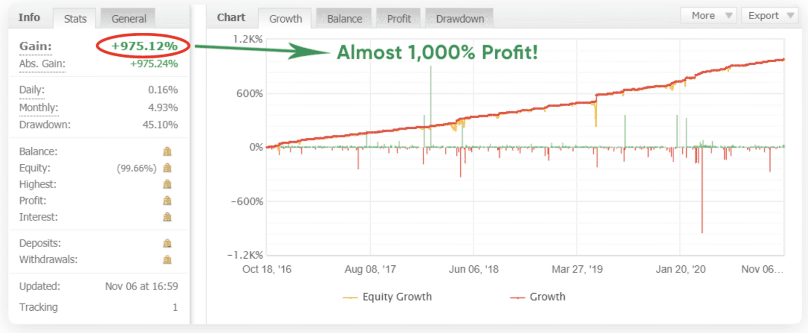 Благодаря более чем 4-летним ДОКАЗАТЕЛЬСТВАМ третьих лиц, несколько проверенных учетных записей могут похвастаться выигрышными сделками месяц за месяцем, в то время как один счет приносит примерно 1000% прибыли за несколько коротких лет!