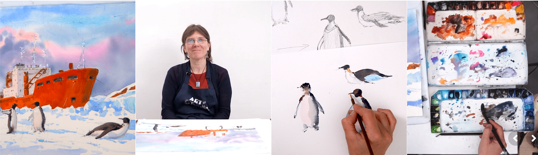 Мастер-класс вдохновлен антарктической экспедицией на борту научно-экспедиционного судна «Академик Федоров» у берегов Антарктиды. Пингвины на фоне ледокола, хотя и являются классическим сюжетом, который очень хорошо знаком по фотографиям полярников, все же никого не оставляют равнодушным. Пингвины почти так же прелестны, как котики и рисовать их очень приятно – простая форма эффектно сочетается с яркой черно-белой окраской; кроме того, они забавно двигаются, их позы очень выразительны и не так уж сложны для передачи на бумаге.