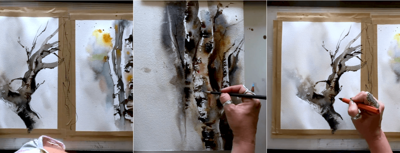 приемам, которые позволяют создавать акварелью самые живописные стволы дерева;