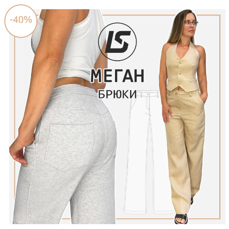 Линия талии занижена, ширинка немного спущена, пояс повторяет контуры тела, как у джинсов. Сзади кокетка и накладные карманы. Модель плотная по бедрам, обратите внимание на прибавки. Можно шить как с ложным гульфиком, так и на молнии. Брюки сидят по бедрам и имеют лёгкое расклешение к низу.