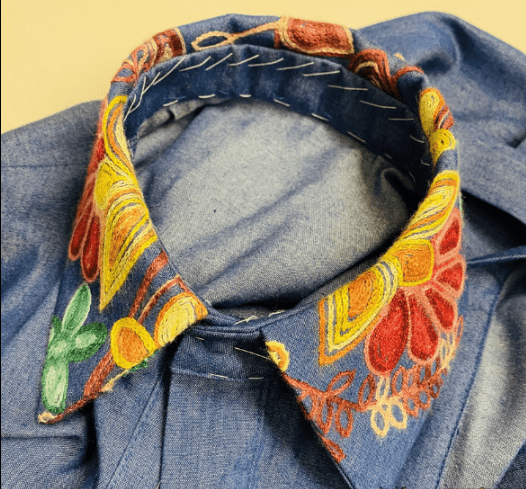 Платье-рубашка с элементами Бохо выполнено из тонкой джинсовой ткани с вышивкой