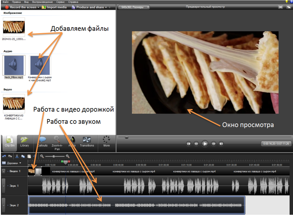 — Предварительный просмотр и прослушивание редактируемого проекта.