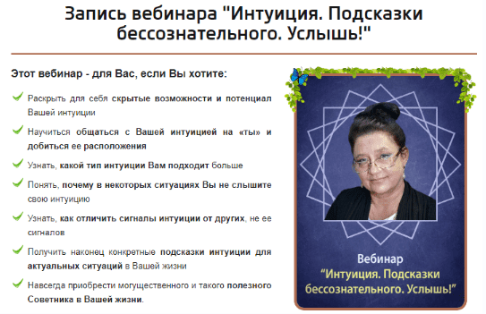 На вебинаре «Подсказки бессознательного и интуиция. Услышь!» мы вместе окажемся в волшебном мире Госпожи Интуиции. Вы познакомитесь с той частью внутри себя, которая всегда готова предложить Вам больше, чем Вы думаете. Эта часть сокрыта в Вашем бессознательном, но при этом является мощнейшим ресурсом для Вашего развития и поиска значимых ответов в самых экстремальных случаях.