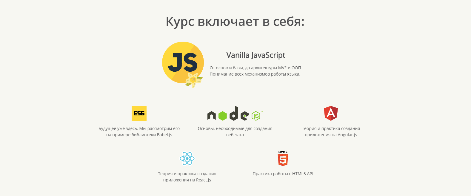 Применять ECMAScript 6. После прохождения курса вы сможете уверенно сказать: «Я знаю ES6!»Модульному написанию JavaScript-кода (browserify, webpack, amd). Научитесь правильно создавать и продумывать архитектуру вашего приложения, чтобы она была поддерживаемой и масштабируемой.