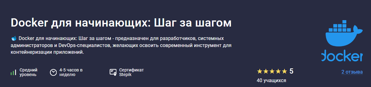 🐋 Docker для начинающих: Шаг за шагом - предназначен для разработчиков, системных администраторов и DevOps-специалистов, желающих освоить современный инструмент для контейнеризации приложений.stepik.org
