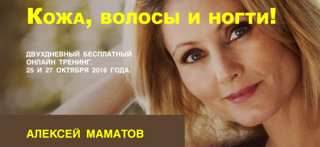 Специально для тех, кто недоволен качеством своих волос, ногтей или кожи, и хотел бы улучшить их состояние, наша команда «Клуба Здоровья и Долголетия Алексея Маматова» разработала свой ОТКРЫТЫЙ ТРЕНИНГ «Кожа, Волосы и Ногти»!